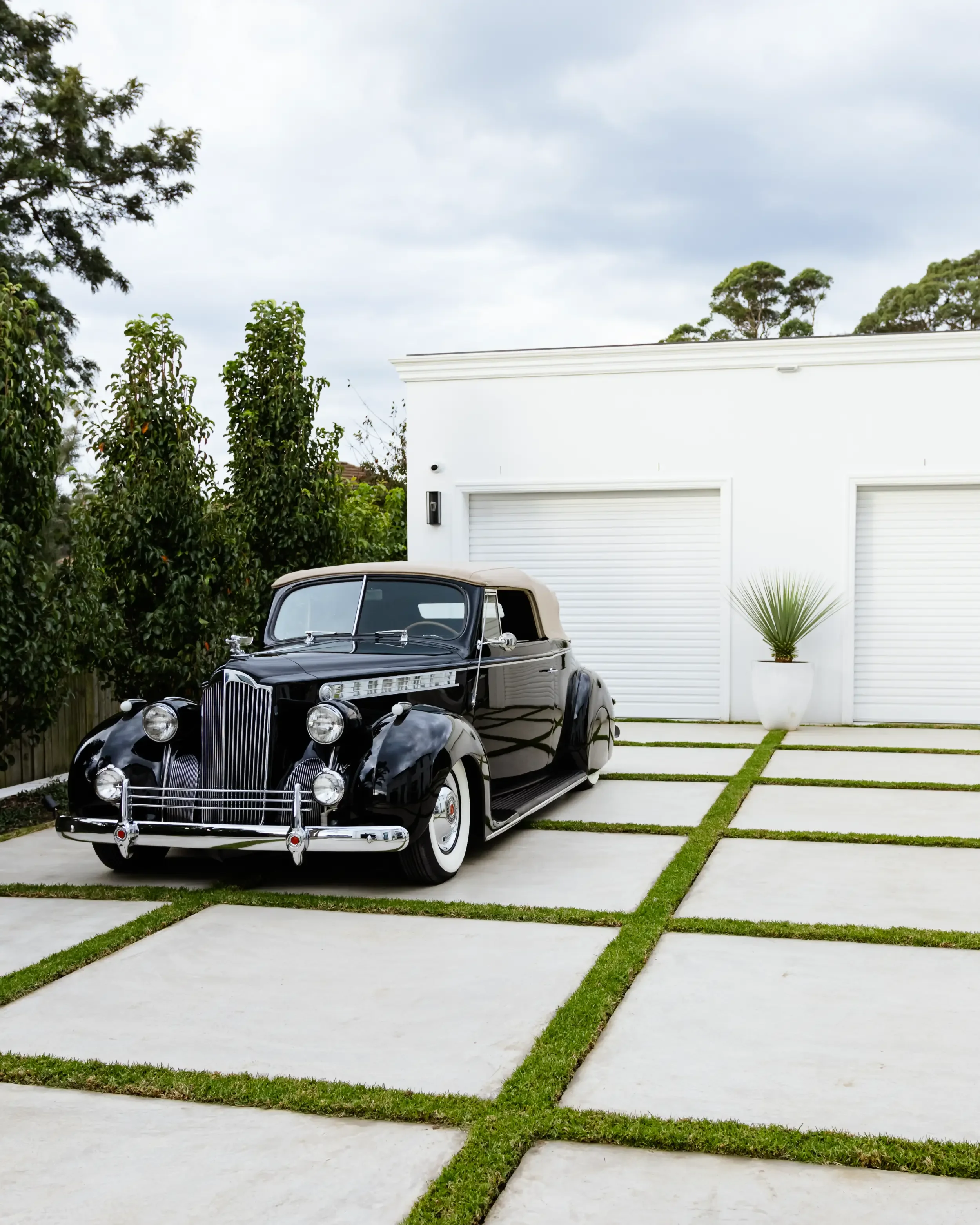 As a vintage car collector, showcasing our clients beloved and timeless pieces, while maintaining a family friendly space, was vital. The result; a custom concrete checkered driveway, side lined with lush Ornamental Pears, leading to a secondary garage where these sets of wheels (and mini alike) are parked humbly.