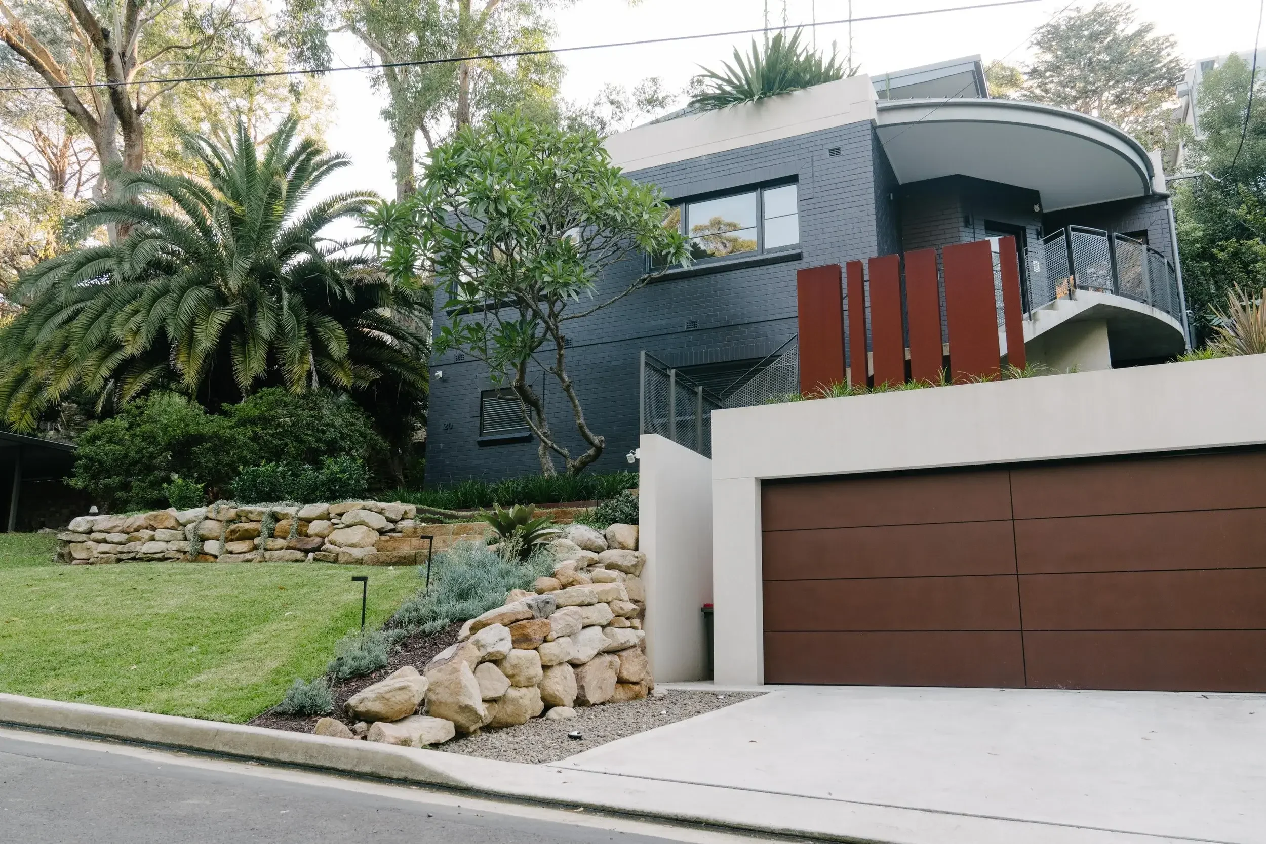 In keeping with the architecture of the home, large sandstone blocks where brought in to create a series of asymmetrical retaining walls, stairs and steppers, at the front of the property, which would soon be filled with a contemporary planting palette.